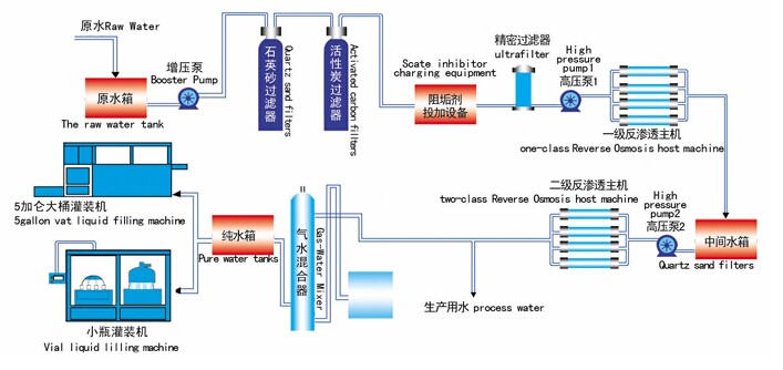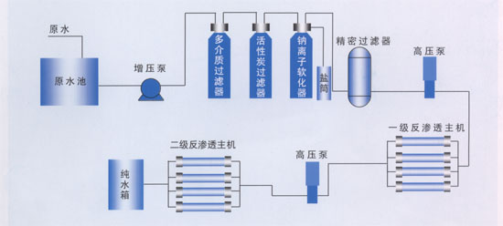 原水→原水加壓泵→多介質(zhì)過(guò)濾器→活性炭過(guò)濾器→軟水器→精密過(guò)濾器→一級(jí)反滲透 PH調(diào)節(jié)→中間水箱→二級(jí)反滲透→純水箱→純水泵→微孔過(guò)濾器→用水點(diǎn)